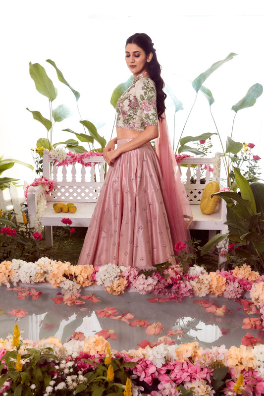 Pink silk lehenga, pomme silk blouse with net dupatta