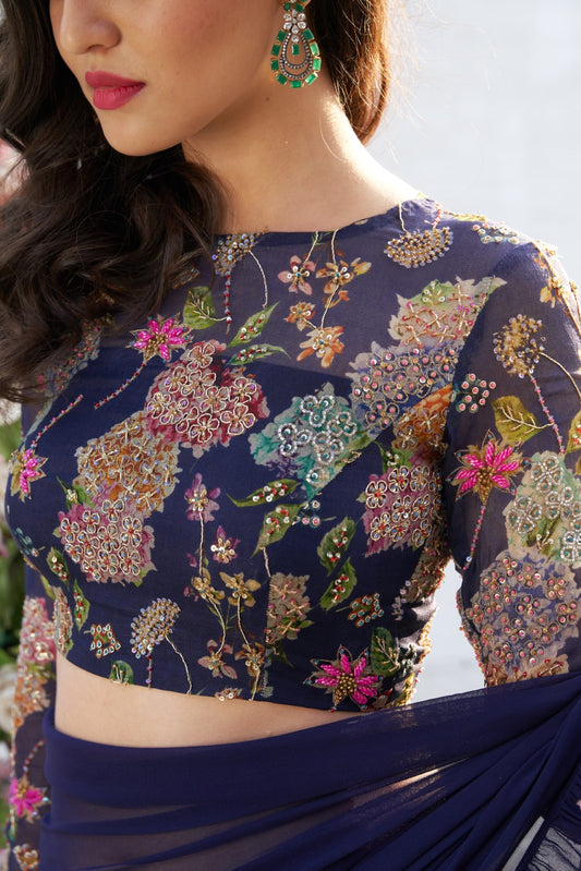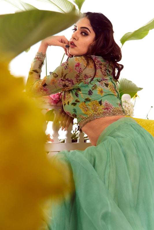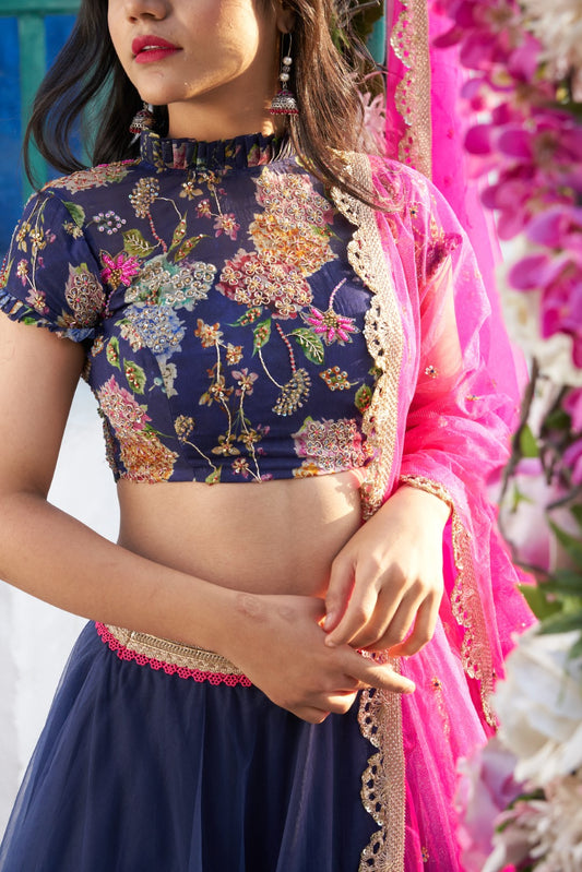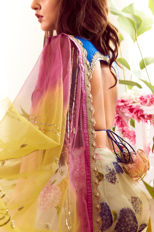 Organza wildflower lehenga with blue raw silk blouse and net dupatta