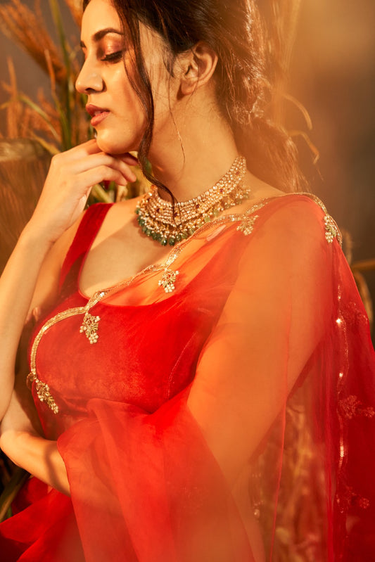 Red velvet blouse, with organza hand-embroidered scalloped saree