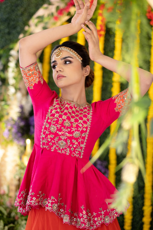 Pop pink embroidered raw silk peplum top with orange net kalamkari embroidered lehenga