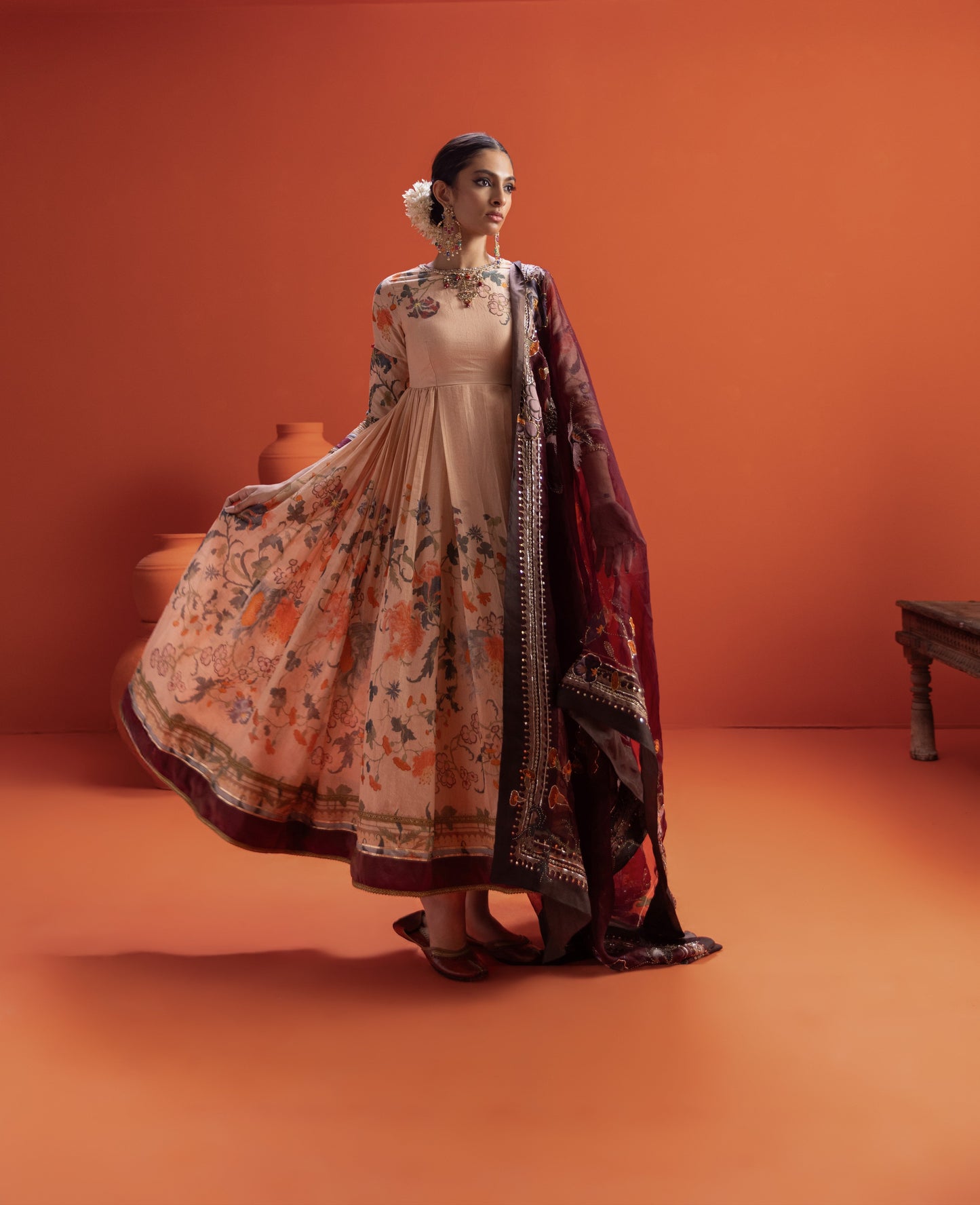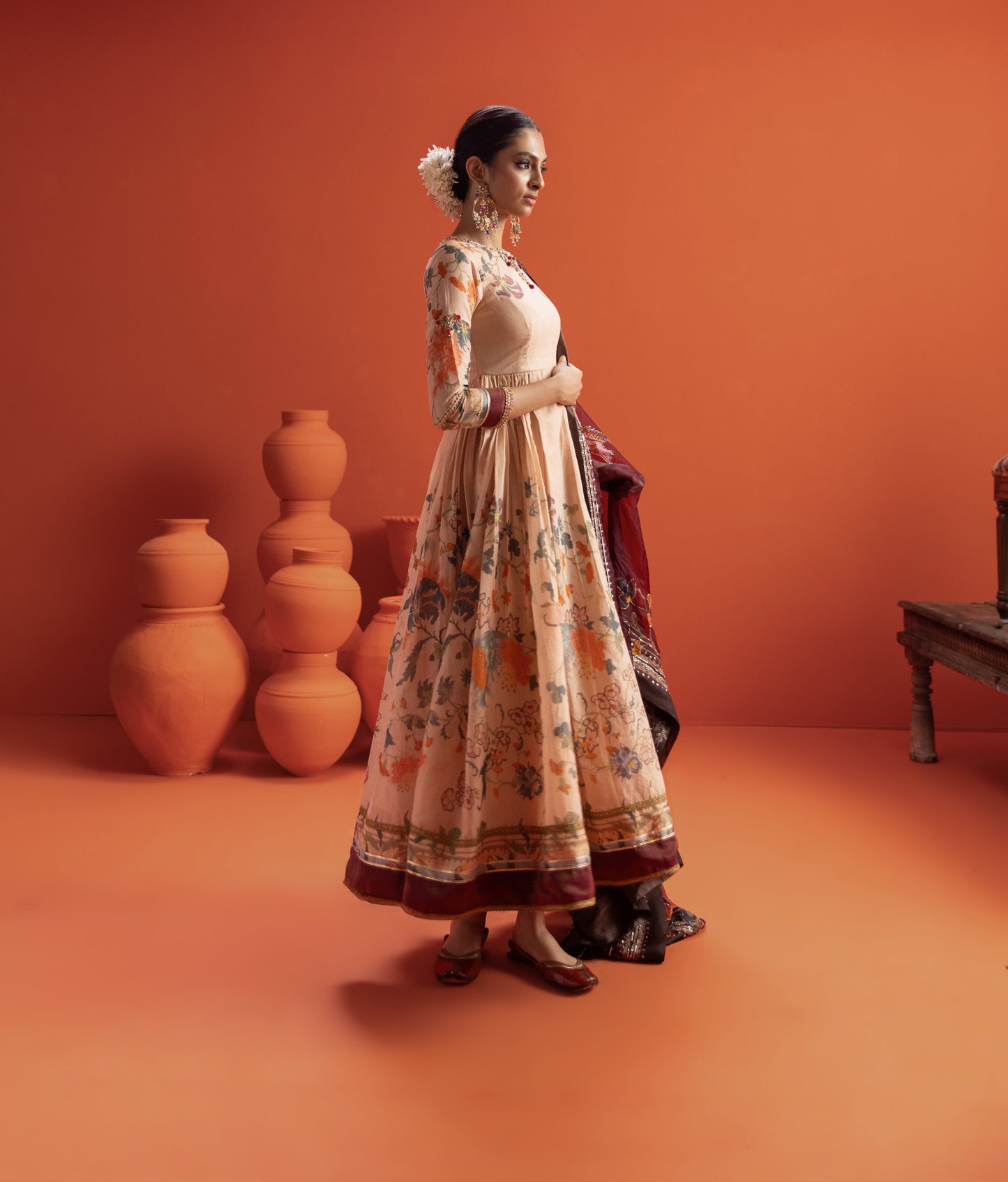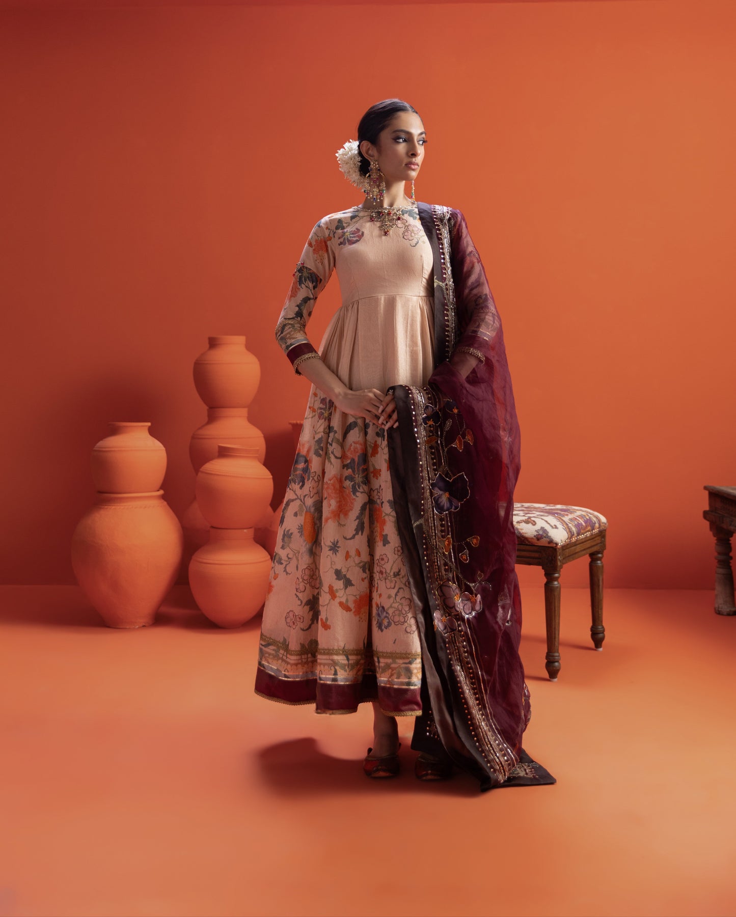 The Rasa beige Anarkali set features a delicate all-over floral print, creating a soft and elegant look. Made from lightweight fabric, it offers a comfortable fit with a flowy, flattering silhouette. The set is paired with a maroon organza dupatta, adding a striking contrast with minimal border detailing. Perfect for weddings, festive occasions, or formal gatherings, this outfit combines feminine charm with a touch of vibrancy, ideal for day or evening wear.