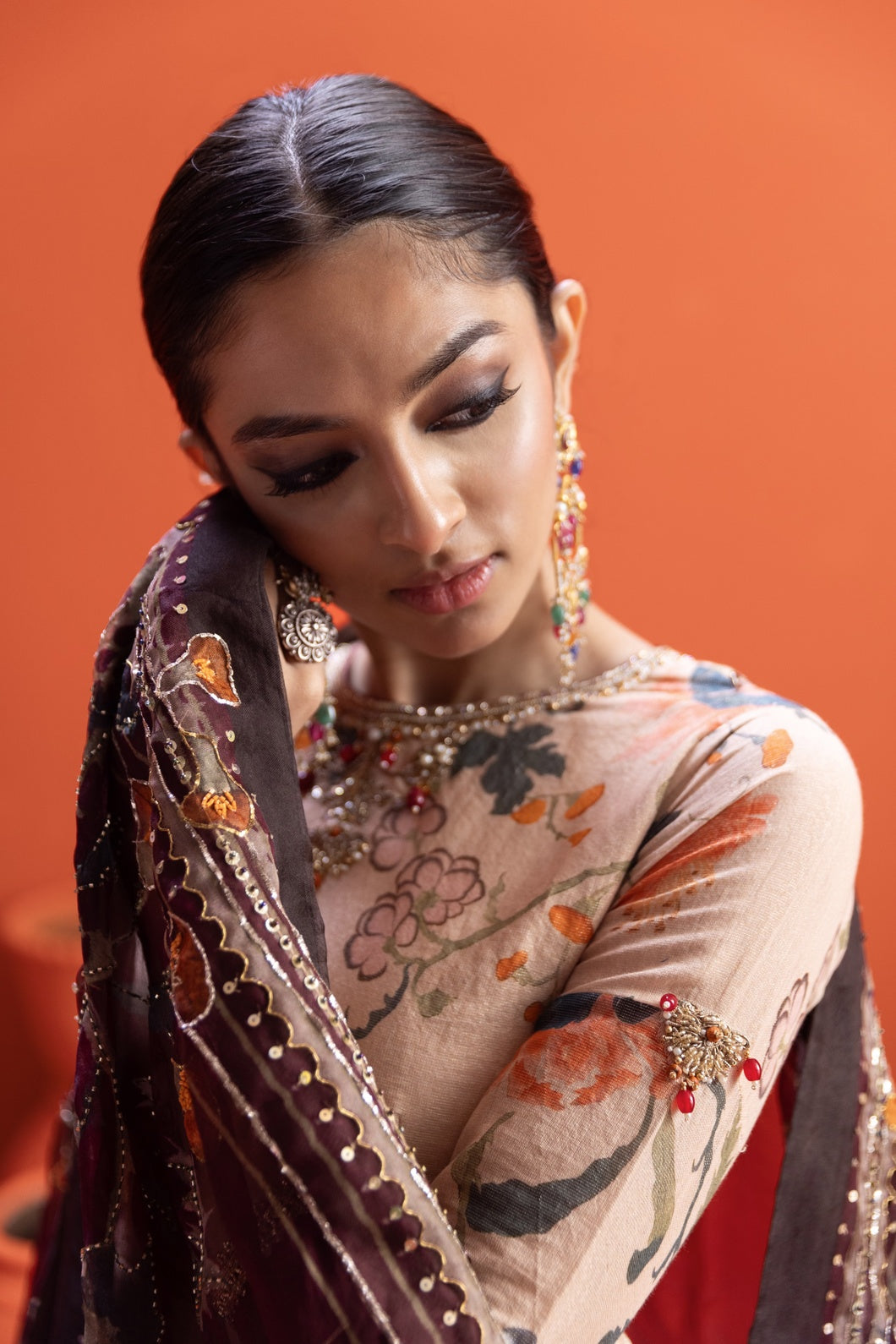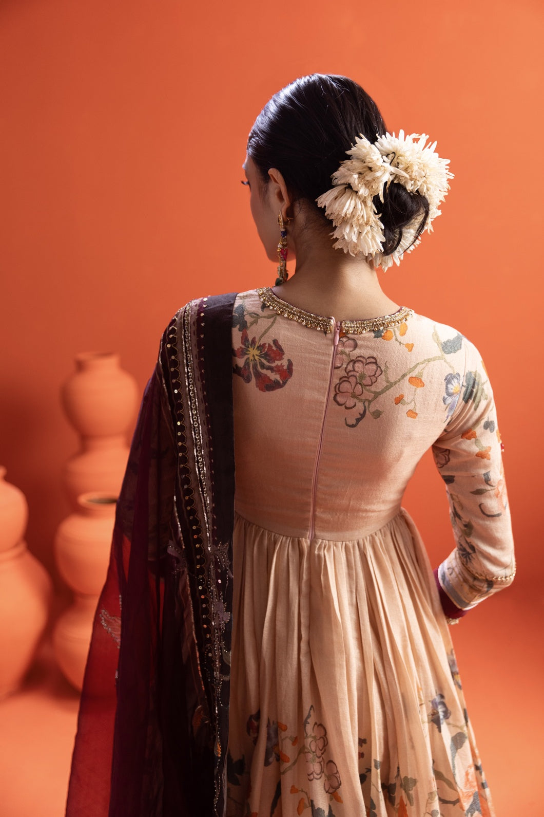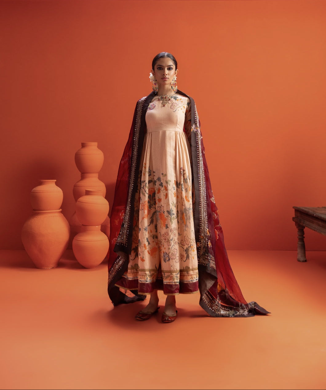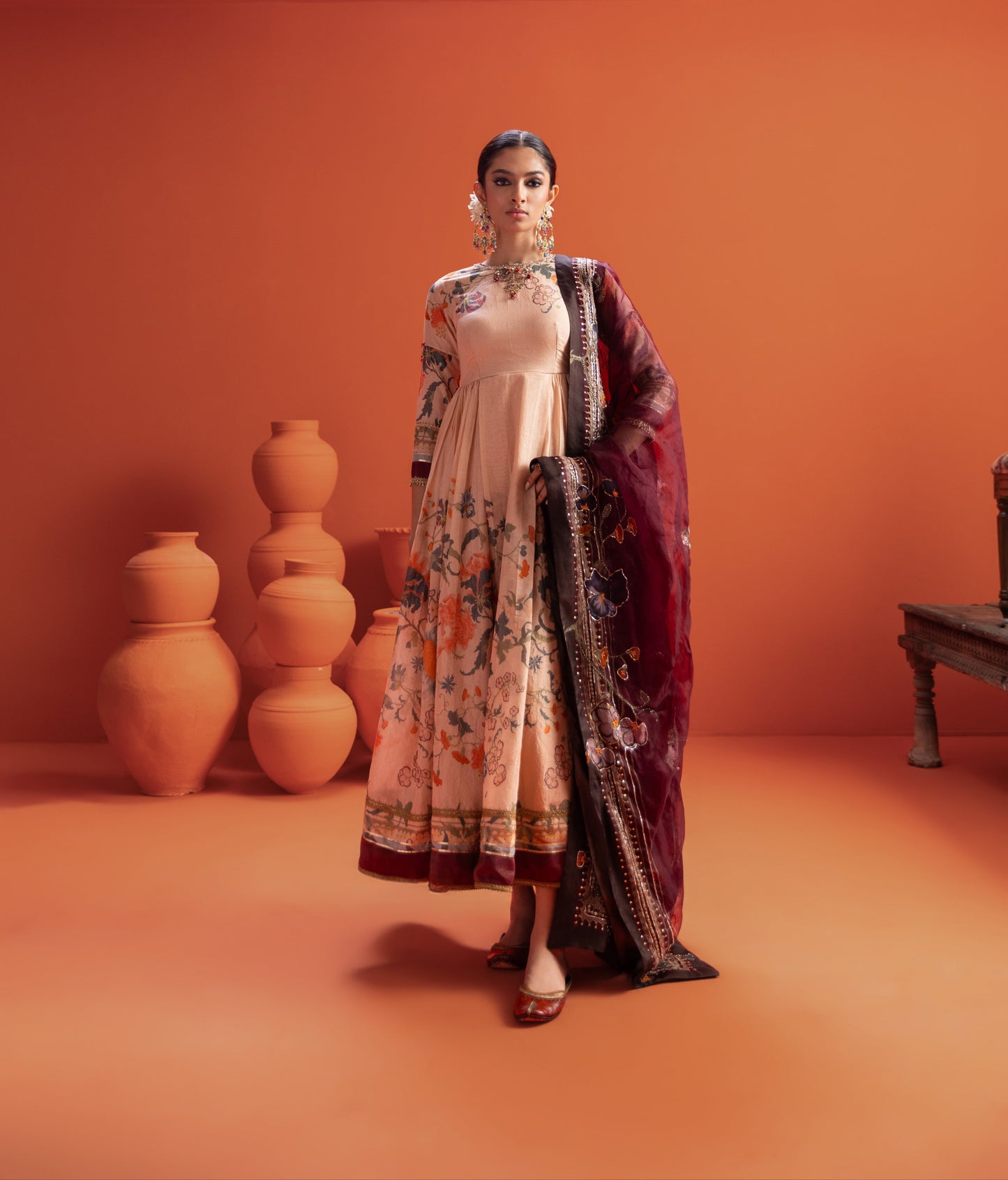 The Rasa beige Anarkali set features a delicate all-over floral print, creating a soft and elegant look. Made from lightweight fabric, it offers a comfortable fit with a flowy, flattering silhouette. The set is paired with a maroon organza dupatta, adding a striking contrast with minimal border detailing. Perfect for weddings, festive occasions, or formal gatherings, this outfit combines feminine charm with a touch of vibrancy, ideal for day or evening wear.